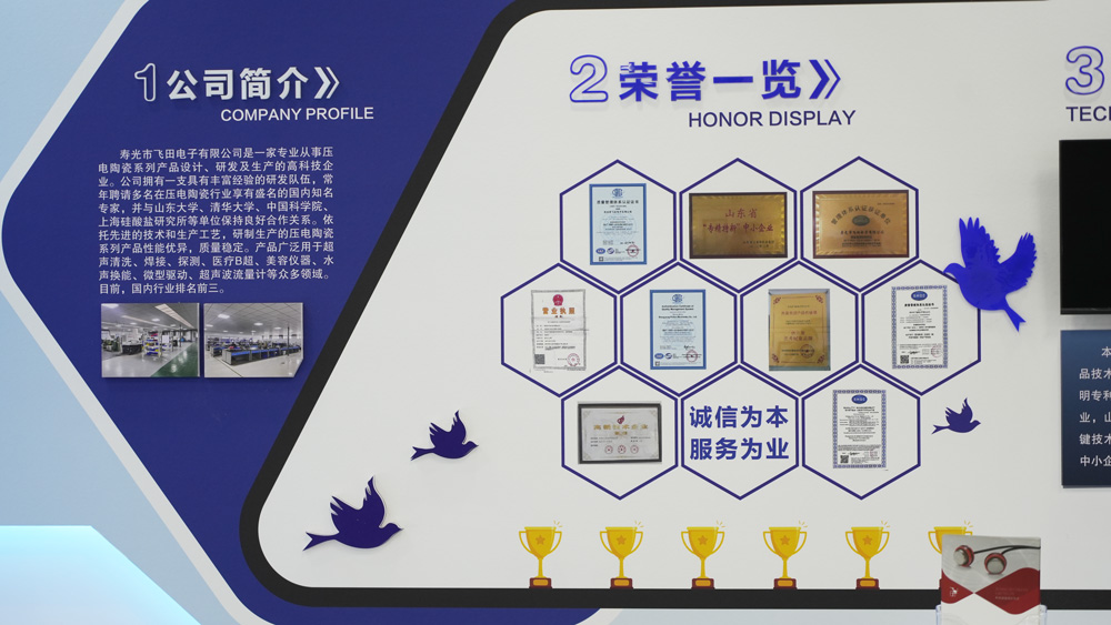 壽光市飛田電子有限公司是一家專業(yè)從事壓電陶瓷系列產(chǎn)品設(shè)計(jì)、研發(fā)及生產(chǎn)的高科技企業(yè)。公司擁有一支具有豐富經(jīng)驗(yàn)的研發(fā)隊(duì)伍,常年聘請多名在壓電陶瓷行業(yè)享有盛名的國內(nèi)知名專家,并與山東大學(xué)、清華大學(xué)、中國科學(xué)院、上海硅酸鹽研究所等單位保持良好合作關(guān)系。依托先進(jìn)的技術(shù)和生產(chǎn)工藝,研制生產(chǎn)的壓電陶瓷系列產(chǎn)品性能優(yōu)異,質(zhì)量穩(wěn)定。產(chǎn)品廣泛用于超聲清洗、焊接、探測、醫(yī)療B超、美容儀器、水聲換能、微型驅(qū)動、超聲波流量計(jì)等眾多領(lǐng)域。